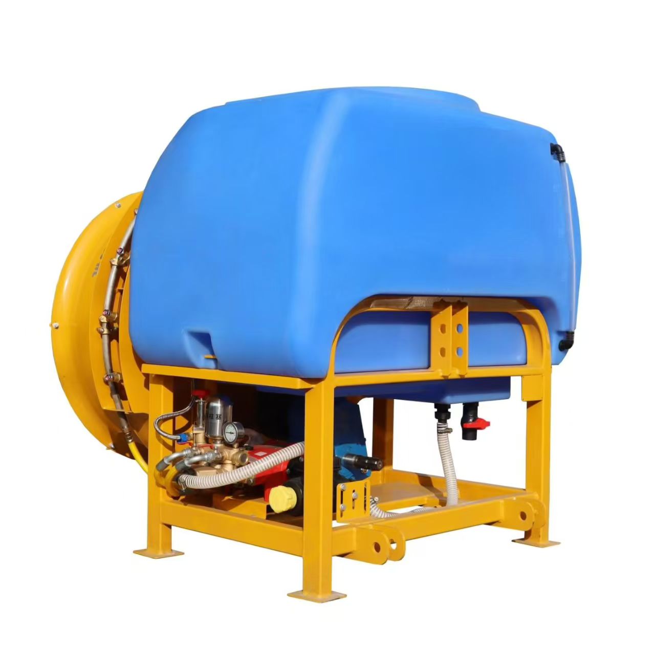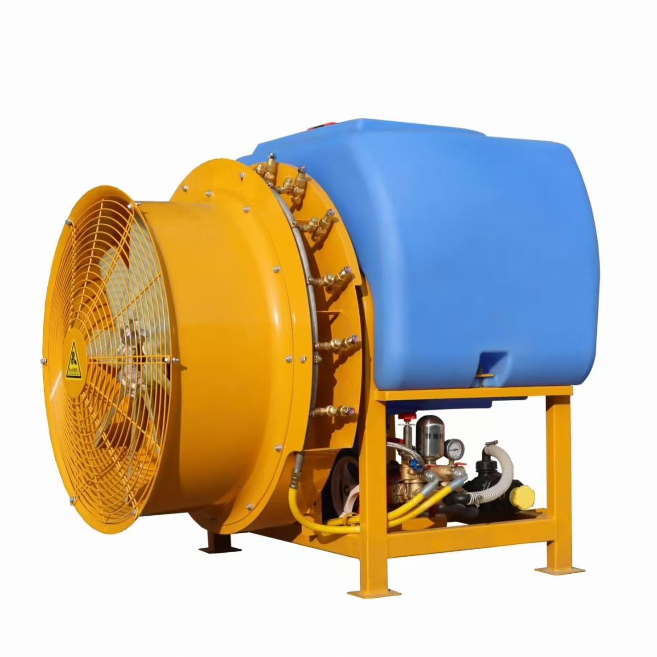 - Sprühkernkomponenten: Ausgestattet mit Hochdruck-Radialventilatoren (Luftstrom bis zu 8.000–12.000 m³/h), korrosionsbeständigen Polyethylentanks (500–1000 l Fassungsvermögen) und verstellbaren Messingdüsen. Der Ventilator erzeugt starke Luftstöße, um Tröpfchen zu transportieren und so eine gleichmäßige Abdeckung auf beiden Seiten der Blätter zu gewährleisten.