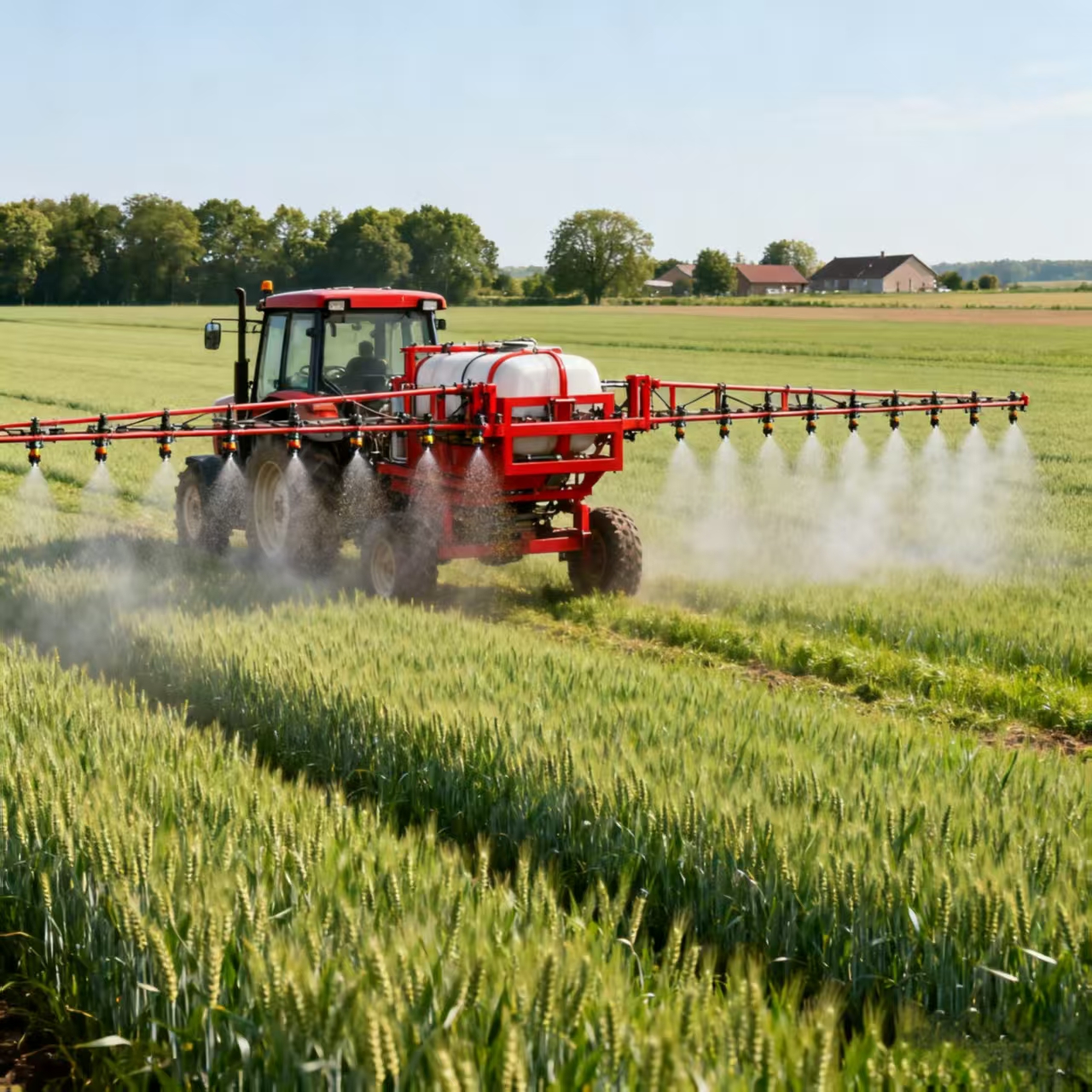 - Auslegersprühgeräte: Betätigen Sie nach einem Prinzip „Direkter Flüssigkeitsanwendung“. Die Pumpe drückt Flüssigkeit (Pestizide, Düngemittel oder Herbizide) aus dem Tank durch Schläuche zu den Düsen des Auslegers. Düsen zerstören die Flüssigkeit in feine Tröpfchen, die vertikal oder in einem leichten Winkel auf die Zielpflanzen fallen. Das Sprühen hängt von der Vorwärtsbewegung des Sprühers ab, und die Tröpfchenverteilung hängt vom Düsenabstand und der Bodengeschwindigkeit ab.