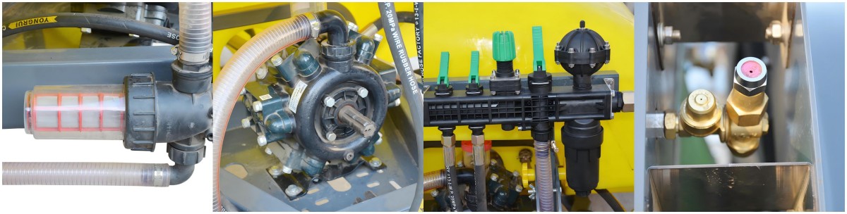 Die Pumpe setzt die Flüssigkeit unter Druck, die durch Schläuche zu Sprühdüsen fließt. Diese Düsen zerstäuben die Flüssigkeit in feine Tröpfchen, sodass die gezogene Sprühmaschine die Pflanzen/Obstgärten in einem Durchgang gleichmäßig bedecken kann.